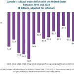 In 2023, the United States accounts for roughly two-thirds of all cultural exports ($18.1 billion, or 67%) and imports ($22.2 billion, or 62%). Canada had a $4.2 billion trade deficit with the USA in 2023. – Statistical Insights on the Arts