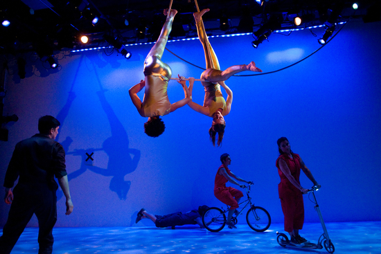 Along with sprucely-managed stunts like pyramids and vaults and catches involving a low trampoline, there are some beautiful sequences: Chanoff stands calmly on Johnson, Colucchia, and Romanski, while they roll smoothly over one another, and Minch, accompanying herself on an electric guitar, sings “The longest train I ever did see. . . .” There are also some telling jokes about spatial orientation and mass in relation to effort. In one brief scene, Schnur turns the real wall into her floor, using Romanski’s bent-over back as a support. In another, Romanski “rides” a stationary bike, pedaling away while Greiner and Schnur shove the thing across the stage. Later, she makes the trip again; this time Marshall straddles her shoulders and Hirshan perches on the handlebars. Now the two “pushers” have a very hard time moving the bike. Talk about an uphill journey.