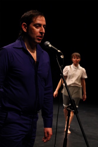 Or consider this. A man, clearly the choreographer, tells a solitary dancer to perform some of the stuff they worked on that isn’t in the piece that we’re watching. Except that now it is. What is he showing us? That the dancer is game, good-humored? That memory is fallible? Yes. But he’s also making us think about the traditional performer-audience relationship, and about process becoming performance. That may be why shortly after his piece begins, he stands awkwardly in front of a microphone and, after a few moments, says softly, “It’s scary up here.”