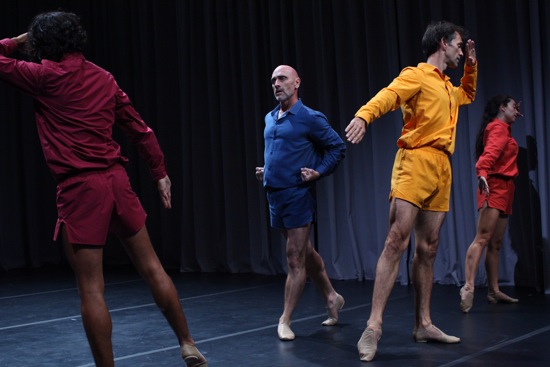 The Kitchen’s performing area has been draped with grayish curtains along the sides and back. Michelle Amet costumed the dancers in short pants and matching long-sleeved jackets in saturated colors: coral (Naiara Mendioroz, violin 1); deeper pink (Fabian Barba, violin 2; egg-yolk yellow (Nuno Bizarro, viola); deep blue (Walter Dundervill, cello). The dancers’ feet aren’t the only sound. Parkins, who provided musical direction and analysis during the creative process, creates a subtle, intermittent “acoustic environment.” Sometimes the sounds are soft whirrings and chirpings; sometimes they rumble. A school bell rings. A siren wails.