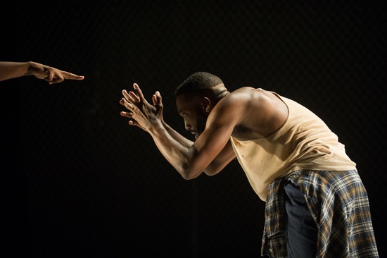 The handcuffed image dominates the final moments. Abraham has being lying inert for some time. On the backboard, an image of an immense housing project appears. A second later it explodes, raining down fragments As the musical selections play on (has someone fed a jukebox?), Monteiro enters with a bag of chips and sits right beside Abraham; for a few minutes, the only sound is of him crunching on his snack. After he is up and dancing again, Williams enters and touches his head; Monteiro collapses, is laid out, dragged to a new spot, and “cuffed.” Then Williams lies face-down on top of him. Washington walks in and lies on top of Williams. Sam Cooke is singing, “I Belong to Your Heart.” For a long time no one moves.