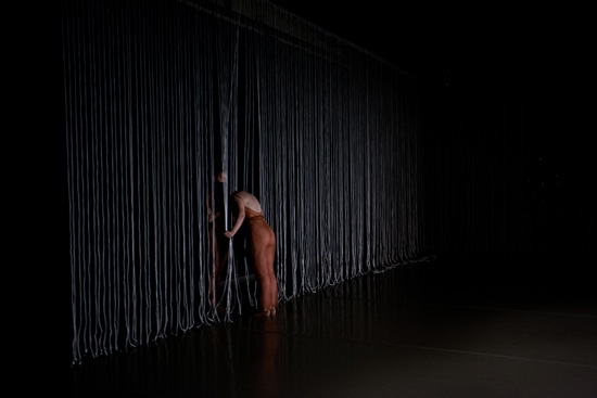 When the piece begins, the four are standing with their backs to the audience, at the opposite long wall of the studio. They stare out of Westbeth’s 11th-floor windows at the lit-up city night. (Those familiar with what was formerly the Merce Cunningham Dance Company’s studio will immediately get the picture). There is a curtain very near them that separates them from us and continues along the wall to our left. This barrier (designed by Jian Jung) is made up of ceiling-to-floor white ropes, so although it could suggest jail bars, it is supple and permeable. In fact, there are two separate instances of a women gathering a number of strands together and standing with the bundle draped over her shoulder. Holly Ko’s lighting sometimes throws the performers’ shadows on the white walls.