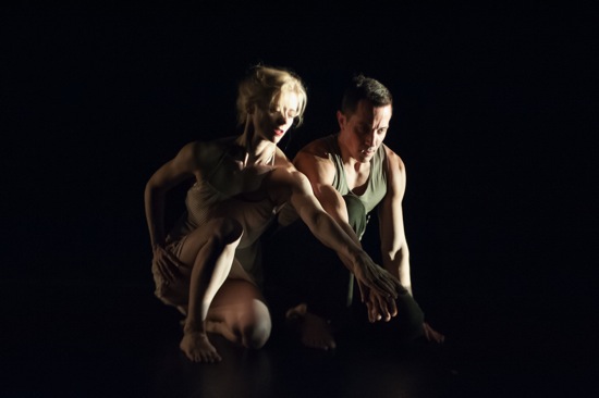 The heat generated between them is formidably erotic. When they assume a ballroom-dance hold, they seem to be trying to melt into each other or set up a friction that could any moment burst into flame. But this is no dance floor they’re occupying. At one point, she’s lying down, grasping his ankles, so that, as he takes big steps here and there, she rolls and twists; it’s hard to tell who’s in charge. And while she sits and watches him dance, the whiplash speed with which he launches himself into a spin conveys not only furious energy but the intentness of a male bird in his courting dance.