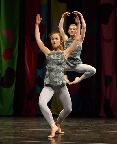 Cunningham’s work has always been greatly admired in France, and it is intriguing to see it delivered with a slight French accent. The eight dancers’ light gray tights and mottled darker gray tunics are by Michelle Amet and the vividly colored, boldly patterned panels that flank the stage on three sides are by master kite designer Jackie Matisse (the painter’s granddaughter). The dancers were raised and trained in France. The expert and daring musicians, however, are Americans: John King (composer, guitarist, violist) and Gelsey Bell (singer, songwriter, scholar).