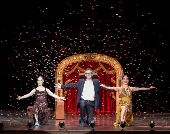Over the course of the evening, we hear the recorded voices of the dancers talking a bit with Glass about what they do. We learn about losing people you love—parents, lovers, friends. And there’s always the show—the show with the looped-up curtains, the top hats and jokes and smiles, with balloons and bubbles and a touch of confetti—all fermented in backstage grit and hours of practice. Lighting designer Jane Cox heightens the magic by turning the cyclorama pink or lavender or deep blue and aiming spotlights and mostly rosy beams. We need, Glass tells us and his colleagues, to “end on a high note.” And they do. Batons twirl. The lights go helpfully crazy. Three acts, two dancers, and a radio host. Check. And much, much more.