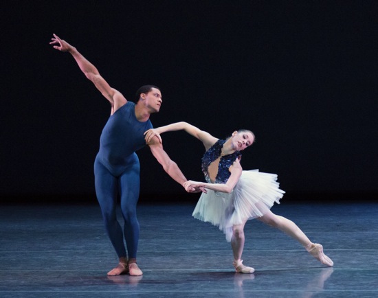 But what Peck heard in the music also influenced him to start a dance game of never-stopping variations. So Peter Walker dances with Brittany Pollack; as he leaves, Taylor Stanley replaces him as Pollack’s partner. When Pollack’s ready to go, David Prottas is standing by to join Stanley. Inevitably, as the duet material cycles through its changes, women dance with women, men with men, men with women. When I think back on it, I envision the dancers staying side by side in many of these fleeting, strikingly clear duets. Although I didn’t think to count the partner-changes, there could have been as many as eleven before the final couple, Ashley Bouder and Adrian Danchig-Waring, takes over the stage.