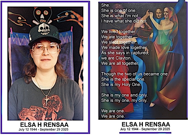 UPDATE: Elsa H. Rensaa died on Sept. 29, 2025. Deep condolences to her partner Clayton Patterson, whose life was one with hers, as he writes in these commemorative lines.