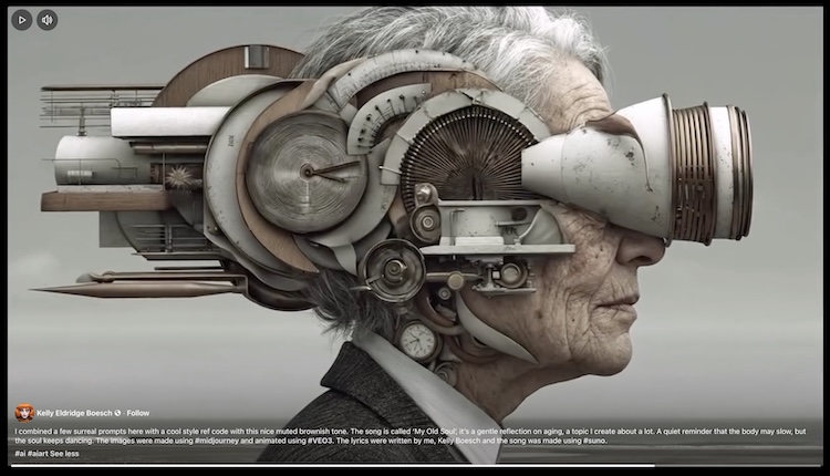 KELLY ELDRIDGE BOESCH, who created the video, writes: “I combined a few surreal prompts with a cool style ref code with this nice muted brownish tone. The song is called ‘My Old Soul’, it’s a gentle reflection on aging, a topic I create about a lot. A quiet reminder that the body may slow, but the soul keeps dancing. The images were made using #midjourney and animated using #VEO3.. The lyrics were written by me, and the song was made using #suno.”