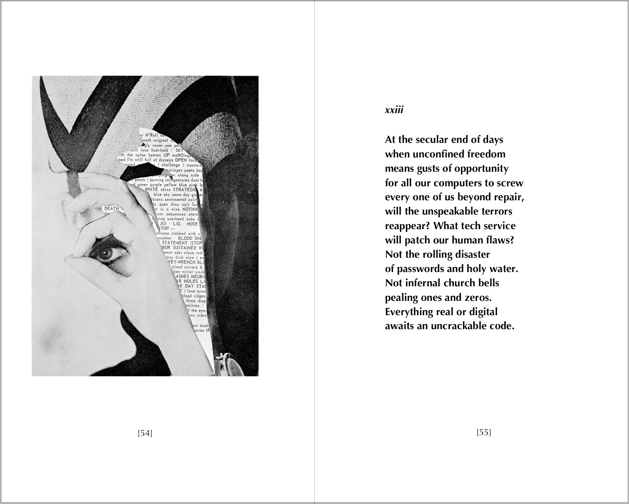 If poetry makes nothing happen, it sometimes uncannily anticipates what will. See the poem facing Norman O. Mustill’s 1967 collage, below. The poem was first published in 2018 by Cold Turkey Press. Now see the report of April 7, 2026, in The New York Times: Anthropic, the artificial intelligence company, has built a new A.I. model that its executives say is capable of cracking the critical software programs of every major operating system and browser anywhere.