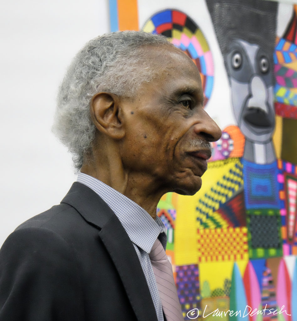 A crowd of avant-gardists was in attendance at a dry but nonetheless spirited two-hour reception, impressed by the vibrancy of Mitchell’s nearly three dozen works, mostly on canvas, ranging in size from 4″ x 4″ to 4′ x 4′. Present and past members of the AACM (Association for the Advancement of Creative Musicians, the collective Mitchell helped establish with Muhal Richard Abrams, Anthony Braxton, Amina Claudine Myers, Wadada Leo Smith, Henry Threadgill and others in mid ’60s) where there, such as Mwata Bowden, Junius Paul, Mike Reed (of Constellation, the Hungry Brain, Pitchfork, the Chicago Jazz Festival programming committee), Tomeka Reid and Kahil El Zabar — along with colleagues Angel Bat Dawid (clarinetist/pianist/vocalist of International Anthem’s The Oracle), cornetist Josh Berman, pianist-synthesist Jim Baker and drummer Michael Zerang.