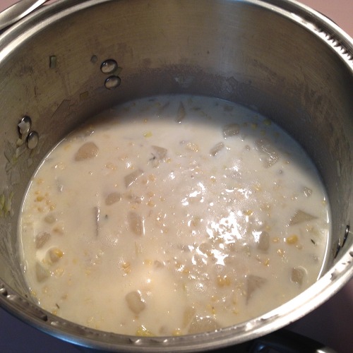 Slowly add milk and/or cream, heating all the while, until you reach the “soup or stew” balance you like. Keep it hot, but don’t boil, because some folks think a corn chowder, any chowder, can overcook.