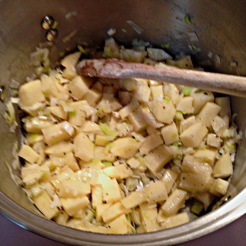 Rinse and dry that warm pot and heat butter at medium until it bubbles or oil till it’s hot and ready. Add chopped potatoes, leeks/onions, salt and pepper, then stir and cook till your allium melts. The usual aroma may evoke appreciation.