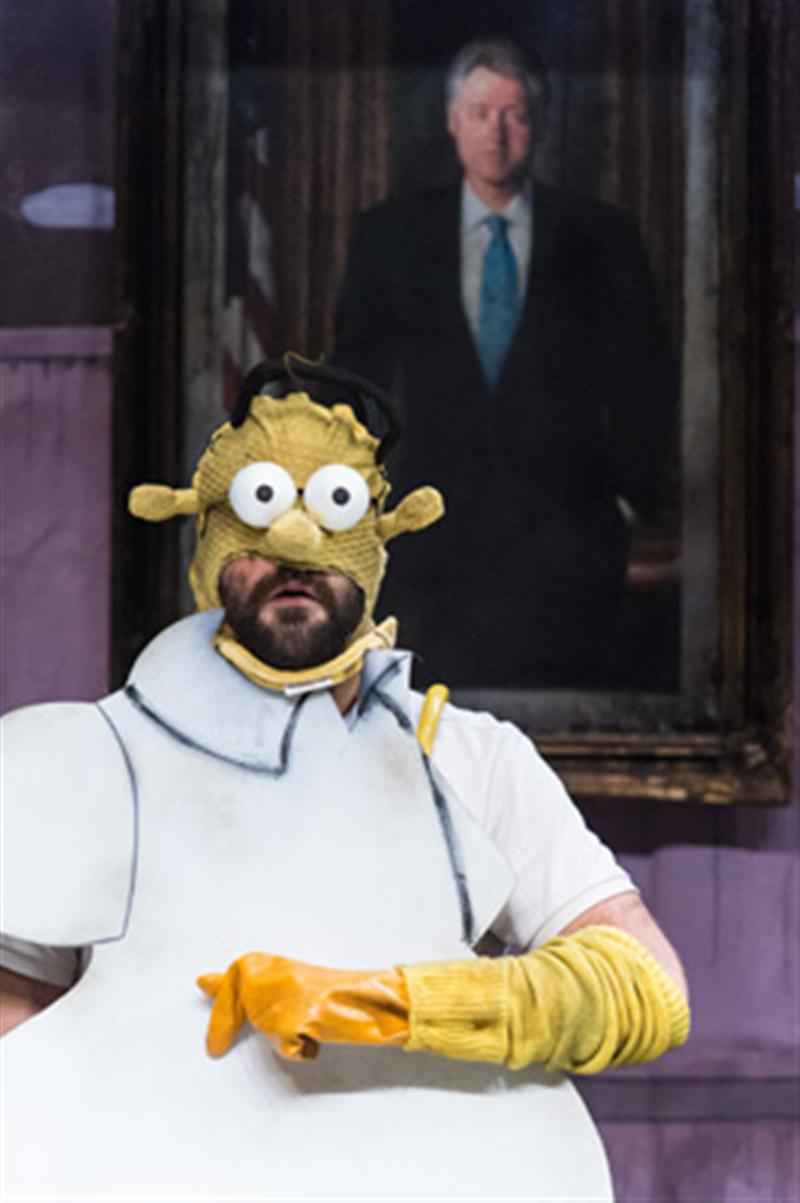 It’s a marvellous text of scraps and mutant fragments. Throughout, you catch snatches of Danny Elfman’s skeetering Simpsons theme tune, its glee turned into sacrament. A cartoon is without consequence – almost 26 years and over 550 episodes in, and the Simpsons remain as blessedly unimproved a family as America can offer. Each episode, as the title sequence demonstrates, resets the family to zero. However, in the future Washburn imagines, every irreverent throwaway detail has become laden with meaning. Bart, a character without conscience, is niw the emotional fulcrum of an epic endeavour, bravely asserting the value of human life. Amid a dizzying range of textual, musical and design references, It’s nice that Bart’s poopdeck confrontation with Sideshow Bob – played as a lordly Captain Hook figure – recalls Peter Pan, another adventure story that mutated into a mawkish theatrical ritual.