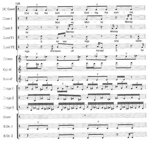 The lack of scores is a big issue for studying Robert Ashley’s music as well; or rather, the discrepancy between his spare working scores, his “production notebooks” as he calls them, and the information overload on the recordings. Years ago when I analyzed Improvement: Don Leaves Linda with a class, Bob kindly gave me the complete MIDI files for the piece, but correctly warned me that they wouldn’t be much help. They were used to trigger events in primitve 1980s software that no current computer still supports, and it’s only here and there that one finds telling correspondences between the MIDI and the recording. Translated to notation, the MIDI files look something like this: