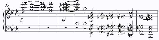 Also, that last chord in the fourth measure is good for driving home the point that inversions matter. Barber uses it all over the place, and as a major 7th chord with the third in the bass and seventh in the melody, the root gets a little buried, for a bittersweet effect that feels both D-flat major and F minor. No wonder it’s laid over so many muted scenes of handsome young men dying in battle. The chord in that position comes back over and over, including at the climax (third, fifth, and seventh chords here):