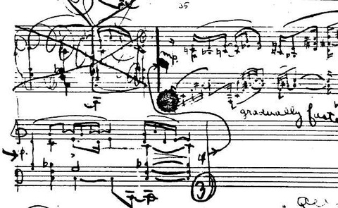 NEW HAVEN – I played the last two movements of the Concord Sonata in high school, and the final four articulated notes of “Thoreau” – G# Bb G C# – have always bothered me. I remember arguing with my piano teacher about them. They don’t seem to have much motivic resonance with the rest of the movement, and the final ambiguous tritone always struck me as un-Ivesian. So now I’m at Yale library looking through the Ives archive, and I’m finding that Ives’s original manuscript presented a different picture. The original ending, which was followed in the 1920 edition but was dropped for the Arrow Press Edition, followed that C# with a dotted-rhythmed A: