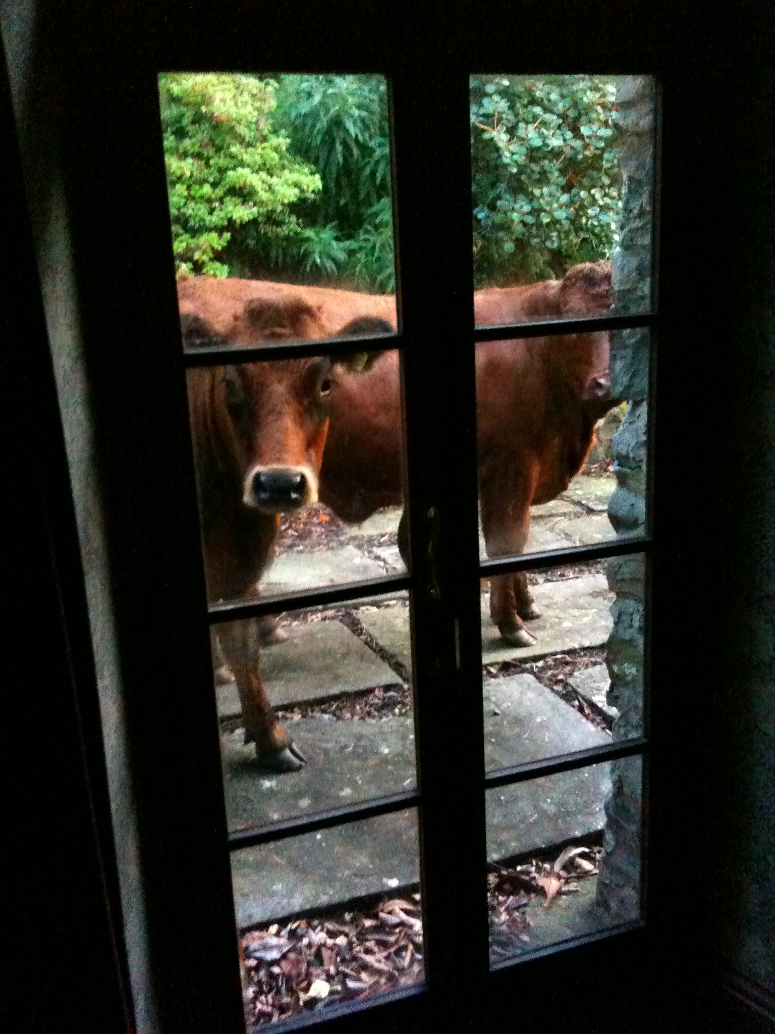 But now we had the summer of renegade cows. Three of them, always the same three, would break out of their field, and come up our driveway. Here are two of them, peering into a French door that leads from our dining room to a small enclosed garden: