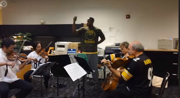 The Pittsburgh Symphony has a long history with the Pittsburgh Steelers. Max Starks, a 6-foot-8, 345-pound tackle on the team, served on the orchestra’s board. A string quartet from the orchestra visited the Steelers, played for some of them. One player conducted, another did a hilarious dance. Great fun for everyone.